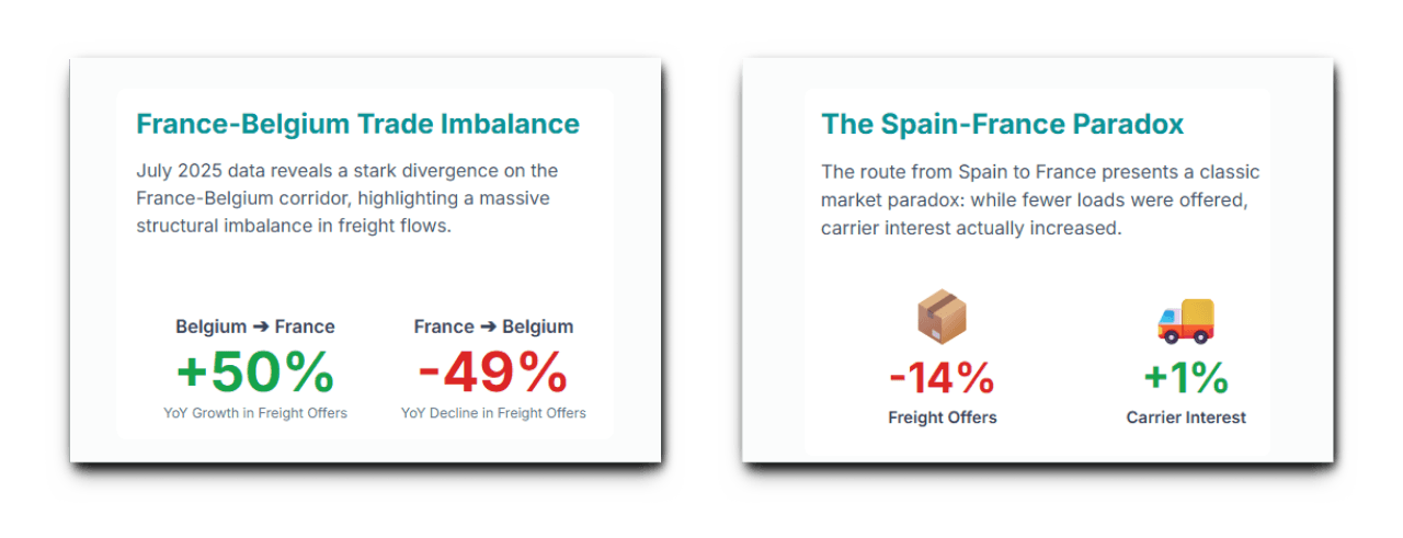 A deluge of imports: At the same time, demand on the Belgium -> France route is gigantic. In July, the number of cargo offers was 50% higher than a year ago.