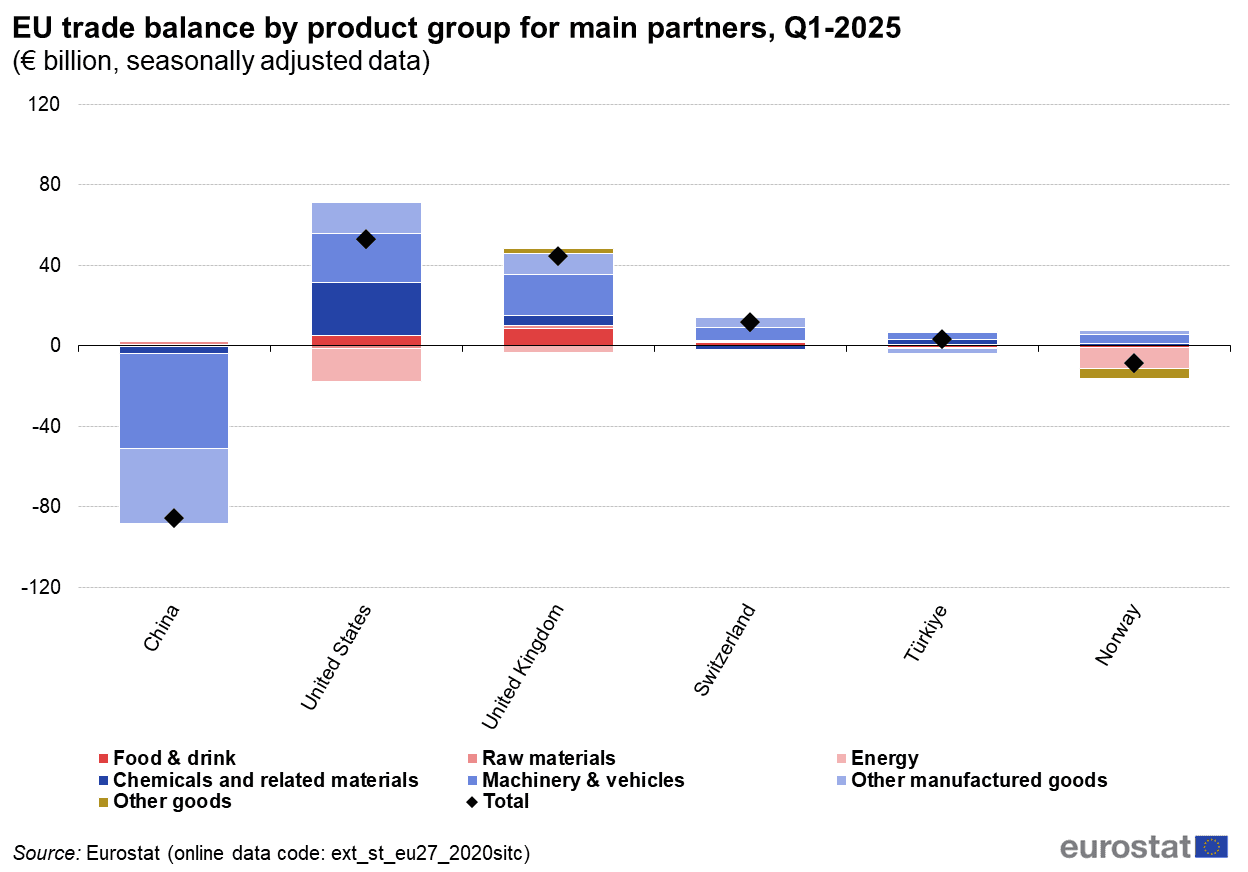 Źródło: Eurostat, [EU - trade balance by product group for main partners, Q1 2025], [1.07.2025]