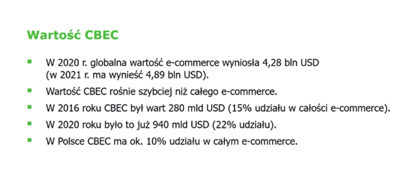 Z badań wynika, że największą rolę w CBEC (cross border e\-commerce) odgrywają marketplace’y – ok. 60% wartości sprzedaży w Europie. Coraz większą rolę odgrywają również duże przedsiębiorstwa, które wdrażają strategię omnichannel. Często mają one doświadczenie w rozwoju stacjonarnych sklepów i infrastrukturę logistyczną, która ułatwia im rozszerzenie działalności o sprzedaż internetową.