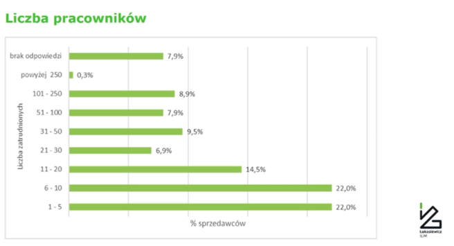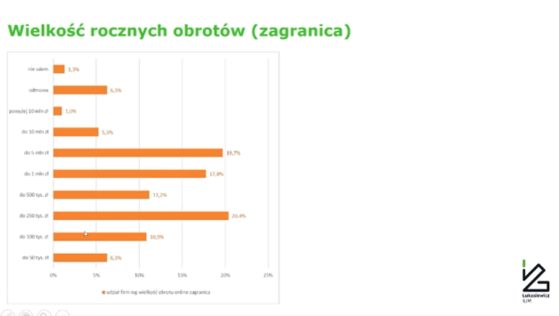 Okazuje się, że u 34,9% badanych firm roczne obroty nie przekraczają 5 mln zł. – Sytuacja polepszyła się. Pamiętam uzyskane wyniki badań sprzed pandemii – mieliśmy masę sprzedawców, którzy byli w dużo niższej grupie, których roczna sprzedaż nie przekraczała 250 tys. zł, a to jest mało, bo mówimy o obrocie – stwierdził prof. Arkadiusz Kawa.
