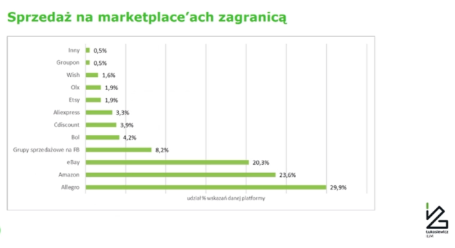 Pierwszym krokiem, tudzież motorem do sprzedaży zagranicznej jest sprzedaż na marketplace’ach. – Kiedy oddaję swój towar np. do Amazon, to tak naprawdę jestem dostępny na 6 rynkach w Europie. Oczywiście trzeba uwzględnić kwestię marży i obsługi tego fulfillmentu, natomiast jest to relatywnie naprawdę proste – ocenia prof. Kawa. Co ciekawe sprzedawcy na pierwszym miejscu podają Allegro, co pokazuje jak silna jest to marka, mimo że nie jest tak dostępna za granicą jak Amazon czy eBay.