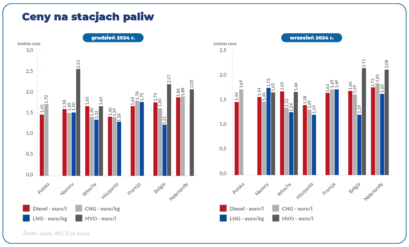 Ceny pozostałych paliw (CNG, LNG, HVO) również generalnie pod koniec ubiegłego roku wzrastały, choć na ich poziom w poszczególnych krajach duży wpływ miały uwarunkowania lokalne, jak np. wysokość związanych z nimi podatków i dotacji. Widać to wyraźnie w przypadku Włoch, w których cena Diesla w grudniu utrzymała się na wrześniowym poziomie (w przeciwieństwie do pozostałych analizowanych krajów), a HVO równała cenie oleju napędowego, podczas gdy np. w Niemczech była wyższa ponad 1,5 raza.