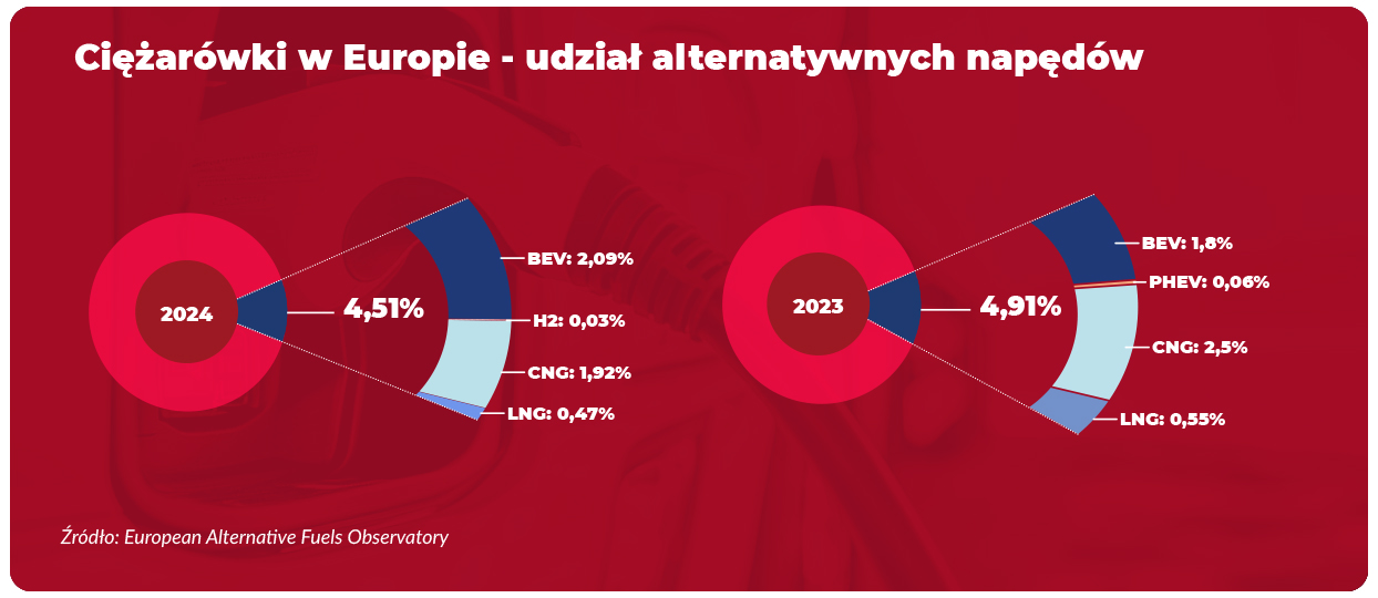 Ani CNG, ani LNG czy HVO nie są jednak na razie alternatywą, mogącą realnie wpłynąć na wysokość kosztów europejskich przedsiębiorców. Nowe ciężarówki wykorzystujące najpopularniejszą alternatywę z wymienionych – CNG – stanowiły bowiem w ubiegłym roku zaledwie 1,92 proc. wszystkich zarejestrowanych trucków. Ustąpiły też miejsce lidera alternatywnych napędów autom elektrycznym, pierwszy raz w historii.