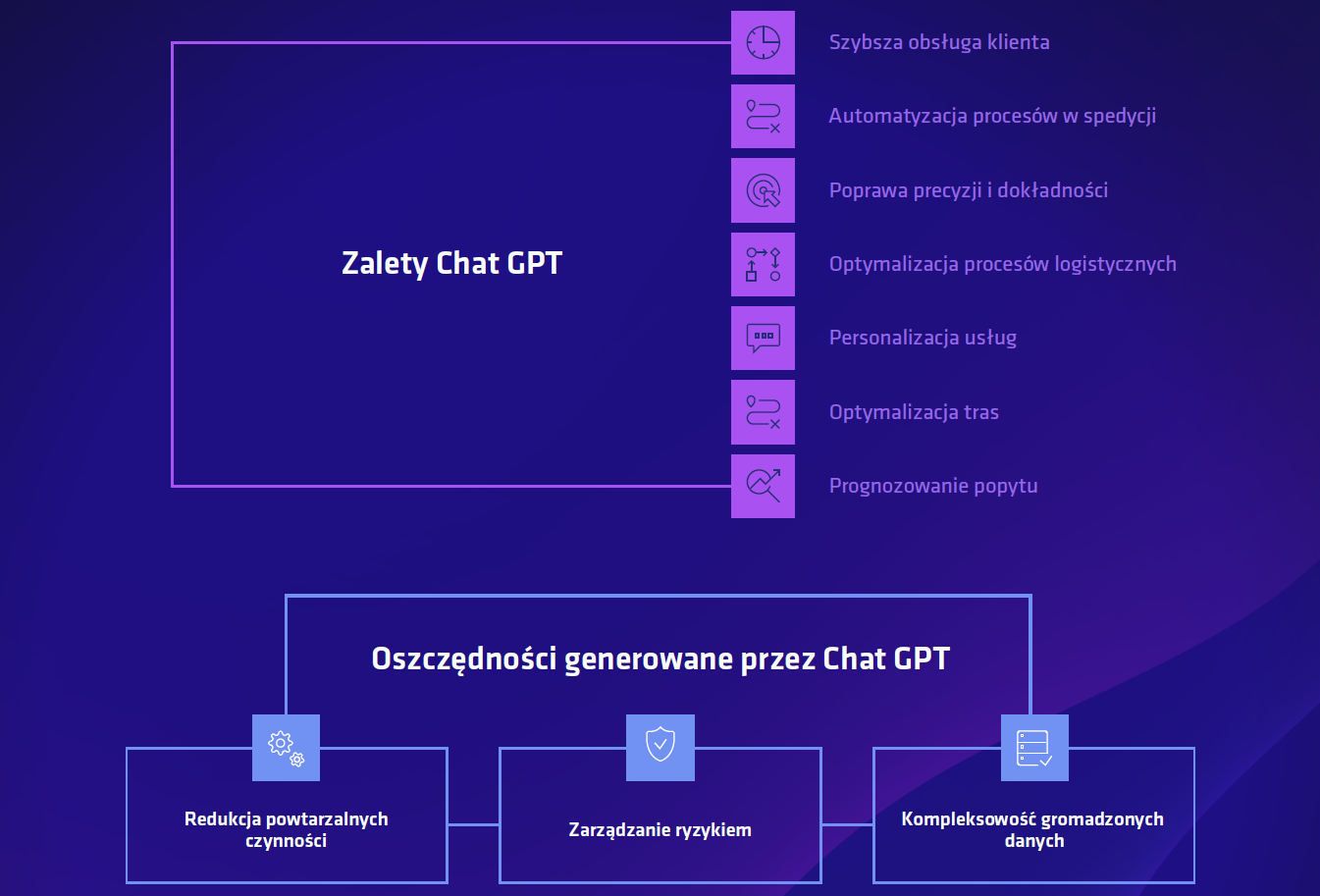 Narzędzia sztucznej inteligencji, a w szczególności chat boty mogą służyć, jako instrument do automatyzacji odpowiedzi na zapytania klientów. Chat zweryfikuje już podczas pierwszego kontaktu, czy dany kontrahent jest wiarygodny. Przefiltruje on dostępne na jego temat informacje w sieci. Co więcej, kolejną z zalet chata GPT jest optymalizacja trasy dostaw. Wykorzystuje on w czasie rzeczywistym informacje pogodowe, dane o wyłączeniach poszczególnych tras z użytku, informacje o świętach w danych państwach, itp. W szerokim zakresie jest on w stanie wspomóc spedytora podczas całego procesu decyzyjnego.