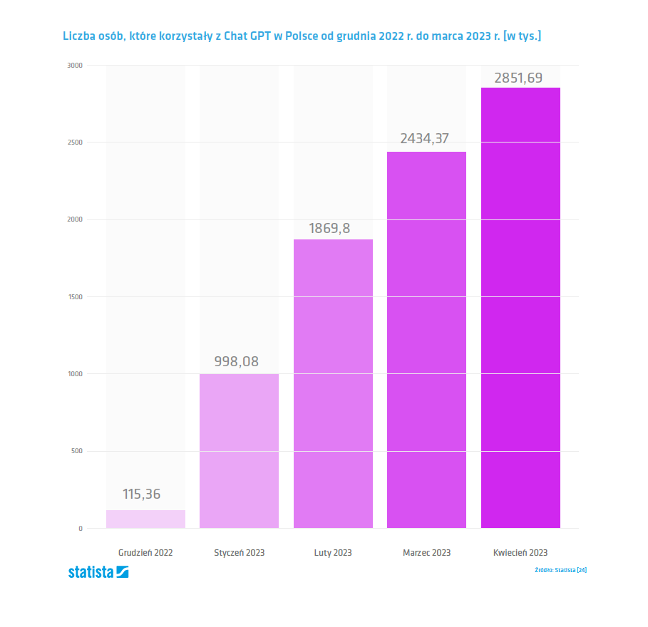 > Chata GPT używają zarówno firmy, jak i osoby prywatne. Jego premiera nastąpiła w listopadzie 2022 roku. Przebił się jak błyskawica. Według danych portalu Statista, opracowanych na podstawie badań realizowanych między grudniem a marcem, to w kwietniu 2023 roku ponad 2,85 mln Polaków korzystało z Chat GPT. Od grudnia 2022 ta liczba wzrosła o 2,3 tys. proc. Z kolei średni czasu spędzany na aktywności z chat botem to 34 minuty