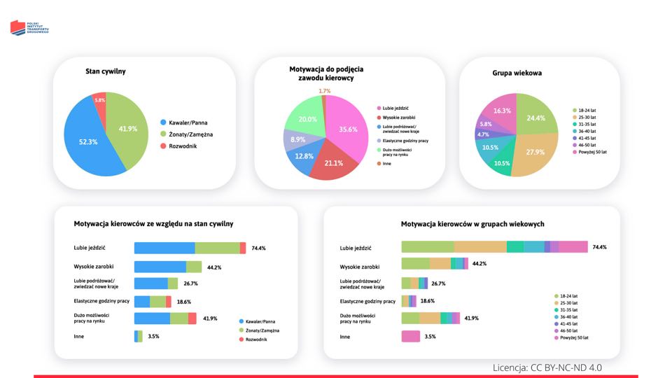 Co ciekawe, osoby pozostające w stanie wolnym częściej wskazywały na zarobki, jako czynnik motywujący ich do podjęcia pracy (33,7%). Dla pozostających w sformalizowanych związkach było to tylko 10,5 proc. Wśród tych pierwszych ważniejszy jest też aspekt zamiłowania do samej jazdy, na który uwagę zwróciło 41,9%, badanych w stosunku do 30,2% dla żonatych/zamężnych osób.