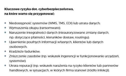 Uczestnicy łańcucha dostaw, w tym firmy transportowe, mają dostęp do wrażliwych danych dotyczących wartości ładunków i ich lokalizacji. W dobie coraz bardziej inteligentnych urządzeń IoT (Internet of Things), w które wyposażone są nowoczesne samochody, rośnie na przykład ryzyko ataku polegającego na unieruchomieniu samochodu z cennym ładunkiem w wybranej lokalizacji lub przesłaniu kierowcy fałszywej informacji