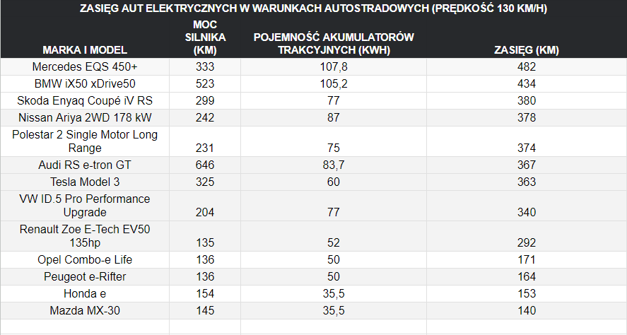 Zasięg aut elektrycznych w warunkach autostradowych (prędkość 130 km/h).
