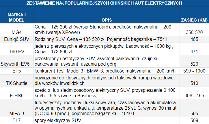 Zestawienie najpopularniejszych chińskich aut elektrycznych.