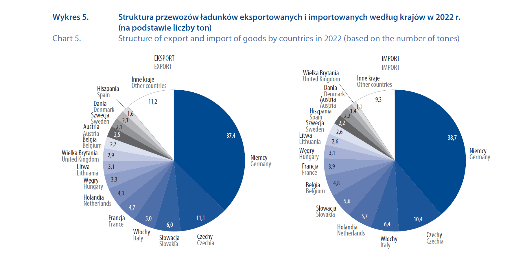 Niemcy były w 2022 roku głównym kierunkiem przewozów zarówno dla eksportu, jak i importu towarów. Prawie 2/5 aktywności zrealizowano na wskazanej destynacji. Niemcy znacząco pozostawiły inne kraje w tyle. Drugie w zestawieniu Czechy posiadały 11,1% udział w eksporcie i 10,4% w imporcie. Ruch z i do pozostałych istotnych państw w naszym obrocie międzynarodowym, kształtował się między 2 a 6 procent. Pierwszą trójkę dla eksportu zamknęła Słowacja, a dla importu Włochy. Ciekawy jest kierunek niderlandzki, ponieważ nasza aktywność przewozowa była tam znacząco większa w imporcie niż eksporcie. Z kolei dla Wielkiej Brytanii bilans był odwrotny.