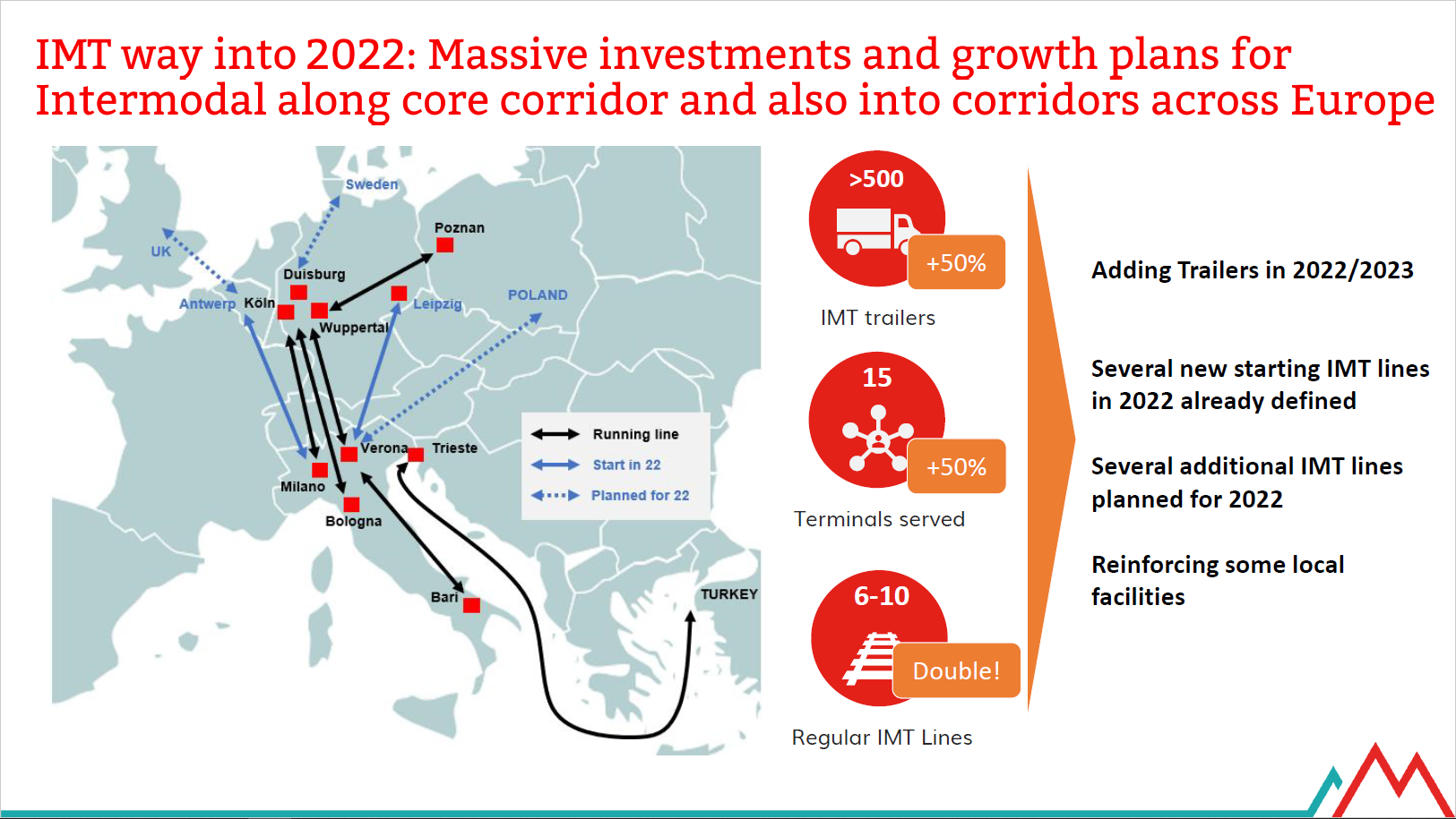 > W ramach Gruber Logistics skupiamy się na rozwoju połączeń intermodalnych. Transportujemy pociągami całe naczepy. Przejazd koleją przez Szwajcarię jest bardziej opłacalny niż drogami. Obecnie realizujemy stałe połączenia na trasach: Werona – Lipsk, Werona – południowa Polska. Mamy w planach uruchomienie połączenia południowej Polski z Niemcami. Dodatkowo chcemy zwiększyć flotę naczep. Optymalizacja sieci, to głównie redukcja pustych kilometrów między miejscami załadunku.
