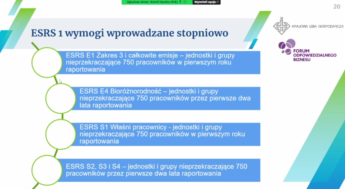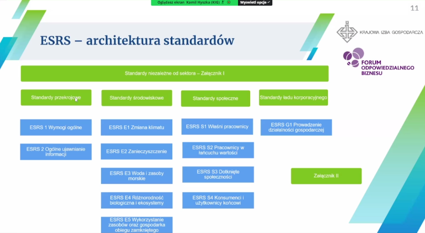 > ESRS dla dużych jednostek zostały przyjęte 31 lipca 2023 roku. Oczekujemy na publikację w Dzienniku Urzędowym Unii Europejskiej. ESRS oparte są na standardach przekrojowych, tematycznych, odnoszących się do konkretnych obszarów oraz standardy sektorowe. Przepisy dyrektywy stosuje się w całości i bezpośrednio, bez konieczności przyjęcia innej – polskiej ustawy. ESRS polega na ujawnianiu informacji, a nie wdrożeniu czegoś w życie. Wewnętrzna ocenia istotności to podstawa do ujawniania informacji