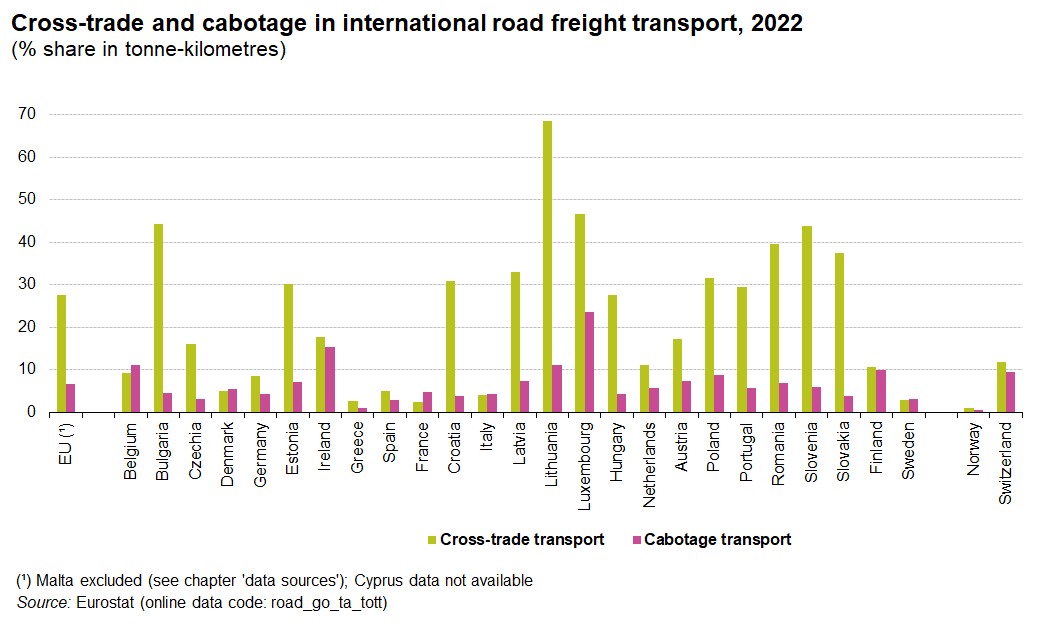 Wykres \& infografika. Puste przebiegi, cross\-trade, kabotaż w transporcie w 2022 roku w wybranych krajach UE