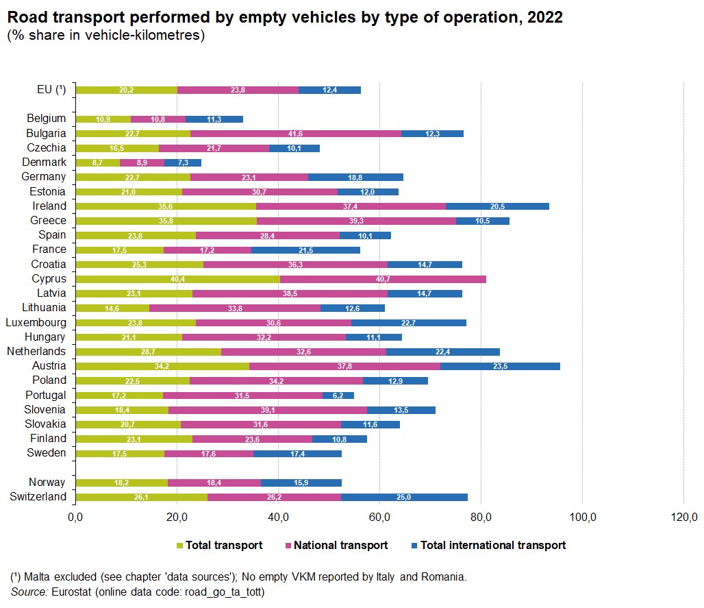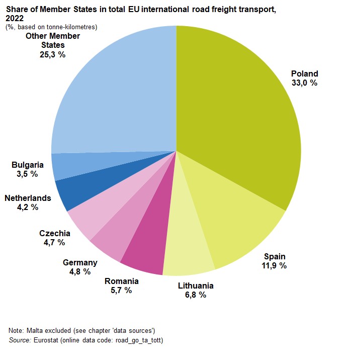 > Polska ma największy, bo 33% udział w przewozach międzynarodowych w Unii Europejskiej. Druga jest Hiszpania, na którą przypada ich 11,9%. Inne państwa, ujęte pojedynczo, odpowiadają za mniej niż jedną dziesiątą przewozów międzynarodowych. Ze statystyk Eurostatu wynika, że co piąty pojazd w Unii Europejskiej jedzie na pusto. Przodują w tym: Cypr, Grecja, Irlandia, Austria. Polska wypada w ogólnym zestawieniu nieco powyżej średniej. Jednakże, w transporcie międzynarodowym nasz kraj ma lepsze wyniki, bo tylko 13% przejazdów na pusto. Wniosek jest taki, że to właśnie polska spedycja dobrze operuje na giełdach i przewoźnicy potrafią sobie tam znaleźć ładunki