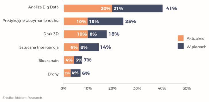 \-\> Z tarczą lub na tarczy \- wyzwania branży TSL w obliczu COVID\-19Również raport niemieckiej organizacji BITKOM (Federalny Związek Firm Branży Informatycznej, Telekomunikacyjnej i Nowych Mediów) potwierdza, że większość firm transportowych i logistycznych postawiło i chce postawić w przyszłości na analizę danych. Jedna na pięć firm korzysta obecnie z Big Data, a kolejne 21 proc. planuje wykorzystanie tego narzędzia. Analityka predykcyjna jest z kolei używana przez 10 proc. respondentów, a kolejne 15 proc, planuje ją wdrożyć. Druk 3D wykorzystuje 10 proc., a 8 proc. ma to