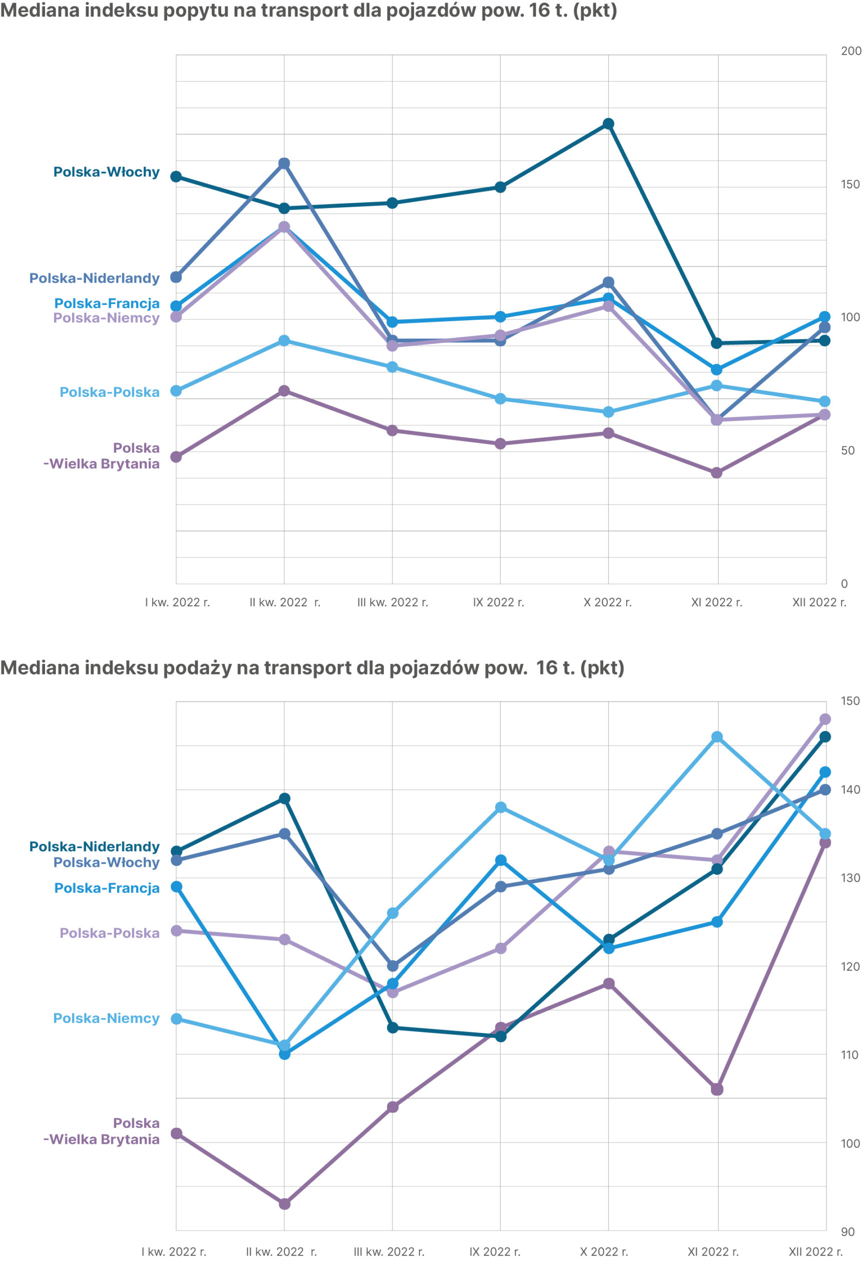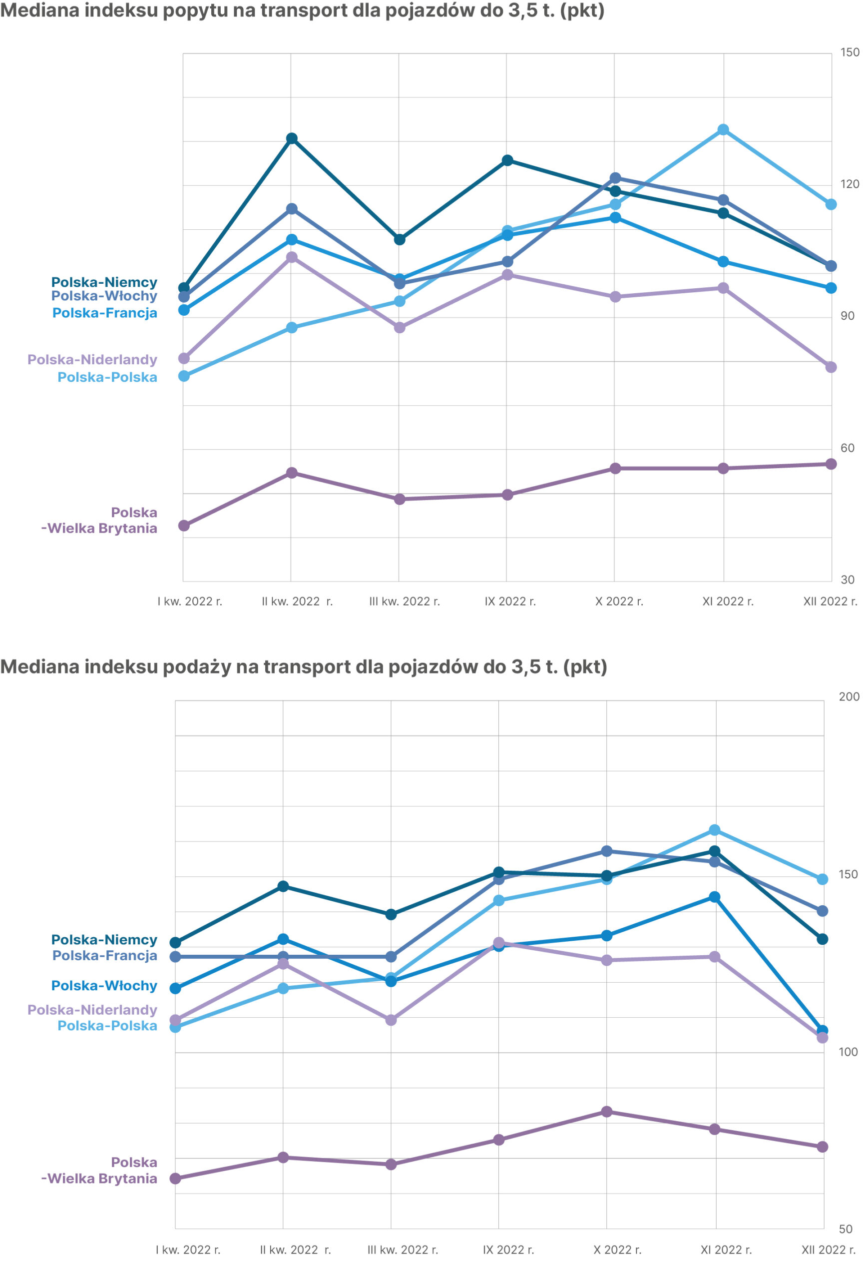 > W 2022 roku, zrobiłem szczegółowe zestawienie popytu na transport na poszczególnych kierunkach międzynarodowych. Na bazie opracowań Michała Pakulniewicza okazało się, że popyt na ciężki transport o dmc powyżej 3,5 tony, na kierunkach: Niemcy, Niderlandy, Francja, wyglądał podobnie. W pierwszej połowie 2022 roku odbicie po obostrzeniach pandemicznych skutkowało wysokim popytem. Dopiero w czerwcu sytuacja zaczęła się zmieniać. Bardzo dobry sierpień sygnalizował, że były to „dobre złego początki”. Wrzesień zapisał się, jako słaby. Kursy wyhamowywały. W ostatnim kwartale 2022 roku tylko październik był w miarę dobry. W okresie przedświątecznym popyt spadł do dramatycznie niskiego poziomu. Zaobserwowaliśmy też małe wahania w transporcie krajowym. Co ciekawe, popyt do Wielkiej Brytanii, odwrotnie niż na innych kierunkach, wzrósł w grudniu. Generalnie podaż była tam znacznie większa od popytu