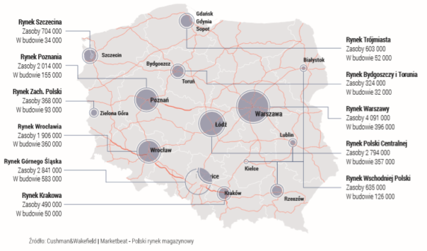 A w ślad za tym rozwinęła się także baza logistyczna w Polsce. Z danych zebranych przez ekspertów z firmy doradczej Cushman \& Wakefield wynika, że na koniec I półrocza 2019 r. w Polsce całkowite zasoby nieruchomości logistycznych wynoszą 16,89 mln mkw. W budowie jest aż 70 nowych projektów, które po sfinalizowaniu inwestycji zwiększą powierzchnię magazynów o kolejne 2,24 mln mkw.