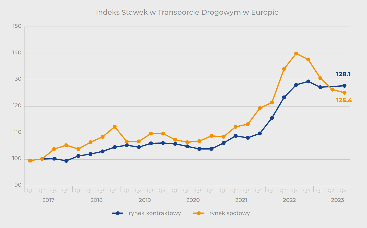 Jak podaje Michał Pakulniewicz w raporcie „Rynek transportowo\-logistyczny w Europie”, przytaczając dane Road Freight Rate Development Benchmark, „indeks stawek spotowych na głównych kierunkach w Europie wyniósł w III kwartale 2023 r. 125,4 pkt.” Przełożyło się to na spadki o 1,2 pkt. w stosunku do II kwartału. Zestawiając te dane z analogicznym okresem 2022 roku odnotowano regres o 14,8 pkt.
