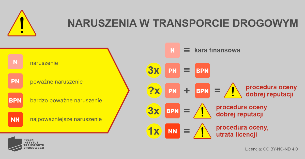 > Przykładowo przewoźnik nie straci licencji za niektóre naruszenia zagrożone karą 12 000 zł, które stanowią poważne naruszenie (PN). Natomiast może ją stracić za naruszenie zagrożone karą 500 zł, jeżeli jest ono zakwalifikowane jako najpoważniejsze naruszenie (NN).