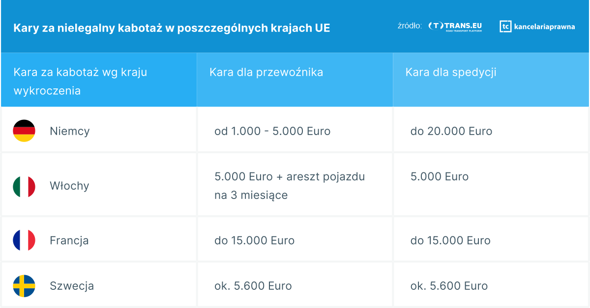 W Niemczech kara dla przewoźnika waha się między 1 000 – 5 000 euro, a dla spedycji dochodzi nawet do 20 tys. euro. We Włoszech mandat opiewa na 5 tys. euro oraz dodatkowo grozi areszt pojazdu na 3 miesiące. We Francji kary są chyba najsurowsze, gdyż dochodzą do 15 tys. euro.