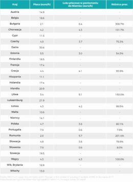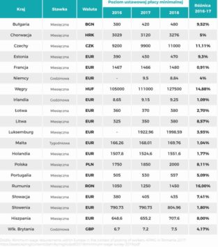 Na powyższym zestawieniu widać, że największy wzrost płacy minimalnej w latach 2016\-2017 zanotowała Rumunia, gdzie wynagrodzenie wzrosło o 16%. Krajem, który miał najniższy wzrost jest Francja, z niespełna 1% podwyżką płac. Polska uplasowała się na 14 miejscu, z wynikiem 8,11%. Lepszy wzrost odnotowały: Litwa (8,57%), Estonia (9\.30 %), Bułgaria (9,52%), Czechy (11,11%), Węgry (14,86%) i wspomniany powyżej lider – Rumunia. Warto przy tym zaznaczyć, że wyniki te obrazują Europę sprzed dwóch lat. Sporo w tej kwestii się zmienia – w Polsce wzrost płacy minimalnej stale się zwiększa i zapowiedziany jest jej dalszy dynamiczny wzrost.