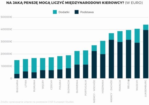Zestawienie w przeliczeniu na Euro przedstawia całkowite szacowane wynagrodzenie kierowców w poszczególnych krajach uwzględniając dodatki oraz pensję podstawową. Widać również jak różnią się proporcje pomiędzy tymi elementami w poszczególnych krajach. Prezentowane dane zostały opublikowane w 2016 roku.