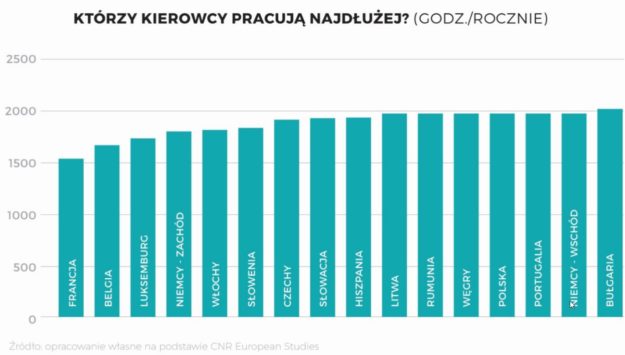 Na wykresie widzimy, że najdłużej za kierownicą pracują kierowcy z Europy Środkowej i co ciekawe dotyczy to również kierowców pracujących we wschodnich landach niemieckich. Najmniej czasu w pracy spędzają truckerzy z Francji i Belgii i to niemal aż o 1/4 od tych pracujących najdłużej.