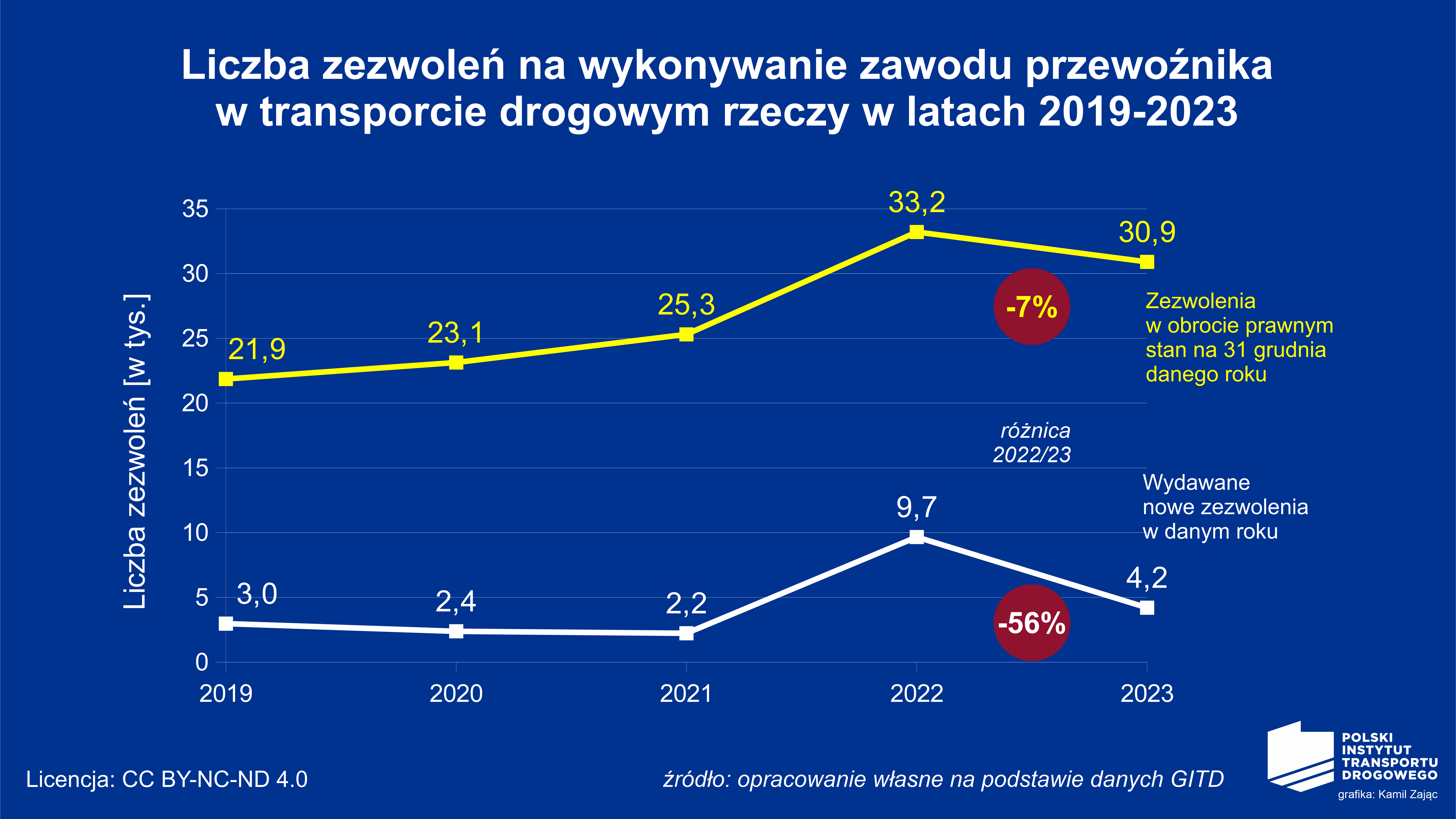 Dobrze obrazuje to liczba wydawanych zezwoleń na wykonywanie zawodu przewoźnika drogowego w międzynarodowym przewozie rzeczy. W 2022 roku wydano 9 659 nowych zezwoleń. Z kolei już w 2023 dynamika spadła aż o 56%, do zaledwie 4 203\. Kryzys widoczny jest na podstawie analizy aktywnych zezwoleń. W latach 2019\-2022 ich liczba rosła, dochodząc do poziomu 33,2 tys. Niestety w 2023 spadła o 2 305 do poziomu 30,9 tys. (\-7%). Podobnie ma się sytuacja na podstawie analizy dynamiki przyznawania nowych uprawnieniń. W 2022 roku przyznano ok. 10,2 tys. nowych licencji na wykonywanie międzynarodowego transportu drogowego. W minionym roku jedynie 4 tys.