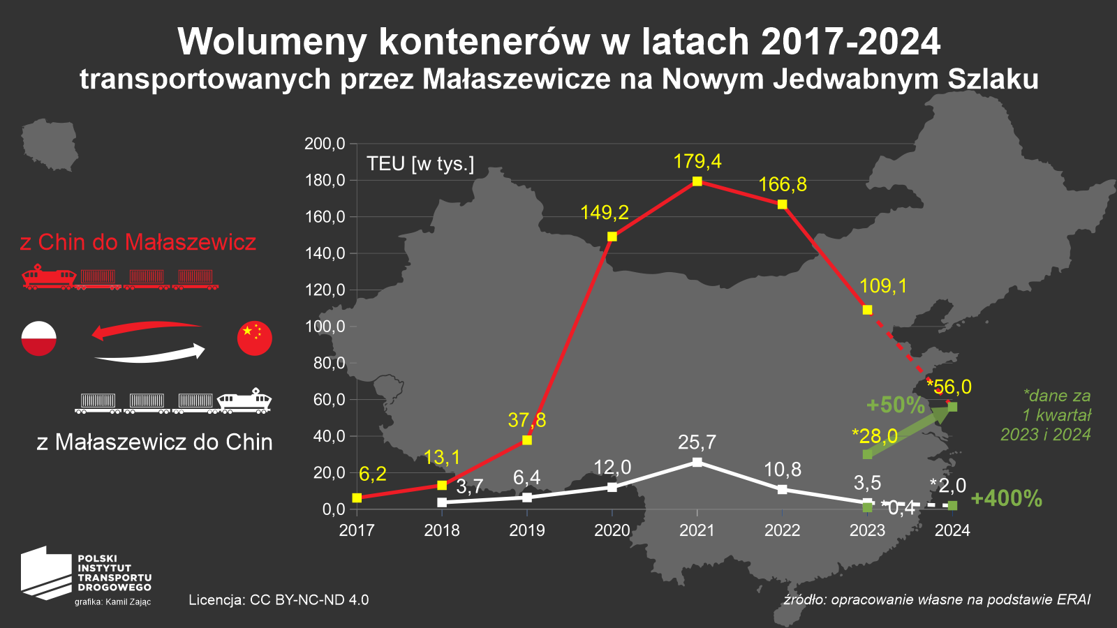 Dane ERAI (Eurasian Rail Alliance Index) za 2023 rok pokazują ogromny deficyt wolumenów na kierunku Chiny – Małaszewicze, w stosunku do odwrotnej destynacji. Ruch z Małaszewicz do Chin stanowił jedynie 3% sumy wolumenów liczonej z obu kierunków. W 2023 roku z Chin do Małaszewicz przeładowano 109,1 tys. TEU, a z Małaszewicz do Chin jedynie 3,5 tys. TEU. W najlepszym jak do tej pory 2021 roku, z Małaszewicz do Chin odnotowano 25,7 tys. TEU, przy 179,4 tys. TEU w kierunku wschód – zachód.