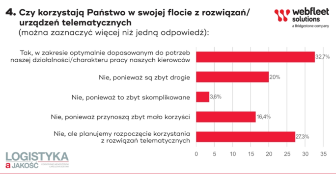 Mimo to, z badań wynika, że w swojej flocie z rozwiązań telematycznych korzysta niespełna 33% respondentów. Wśród głównych barier dla wprowadzenia rozwiązań telematycznych przewoźnicy wymieniają wysokie koszty wprowadzenia takich rozwiązań i czasochłonność ich wdrożenia. Ponadto uważają, że pracownicy poświęcają zbyt dużo czasu na opanowanie obsługi nowych systemów, i przez trudności nie będą chcieli z nich korzystać.