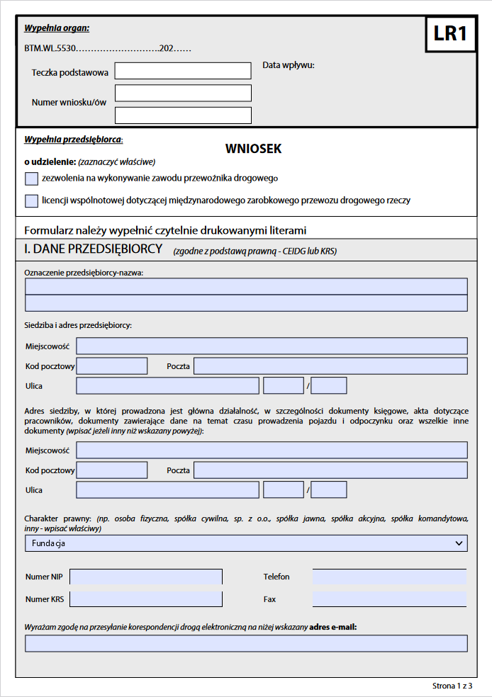 Wniosek LR1 o udzielenie udzielenie zezwolenia na wykonywanie zawodu przewoźnika drogowego i licencji wspólnotowej dotyczącej międzynarodowego zarobkowego przewozu drogowego rzeczy – strona 1z3\. Źródło: Główny Inspektorat Transportu Drogowego