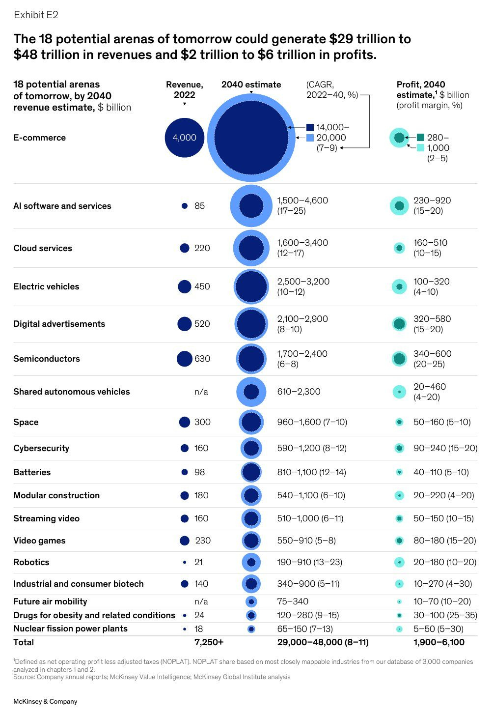 Zgodnie z najnowszym raportem McKinsey \& Company, sektor e\-commerce wyrasta na jedną z najważniejszych aren gospodarki przyszłości. W 2022 roku wartość globalnych przychodów wyniosła 4 miliardy dolarów, a do 2040 roku prognozuje się jej wzrost do 14–20 mld dolarów, co przekłada się na średnioroczną stopę wzrostu (CAGR) wynoszącą 7–9%. Takie tempo rozwoju sprawia, że e\-commerce wyprzedza inne sektory, takie jak pojazdy elektryczne, usługi oparte na sztucznej inteligencji czy cyberbezpieczeństwo, pod względem prognozowanej wartości przychodów.