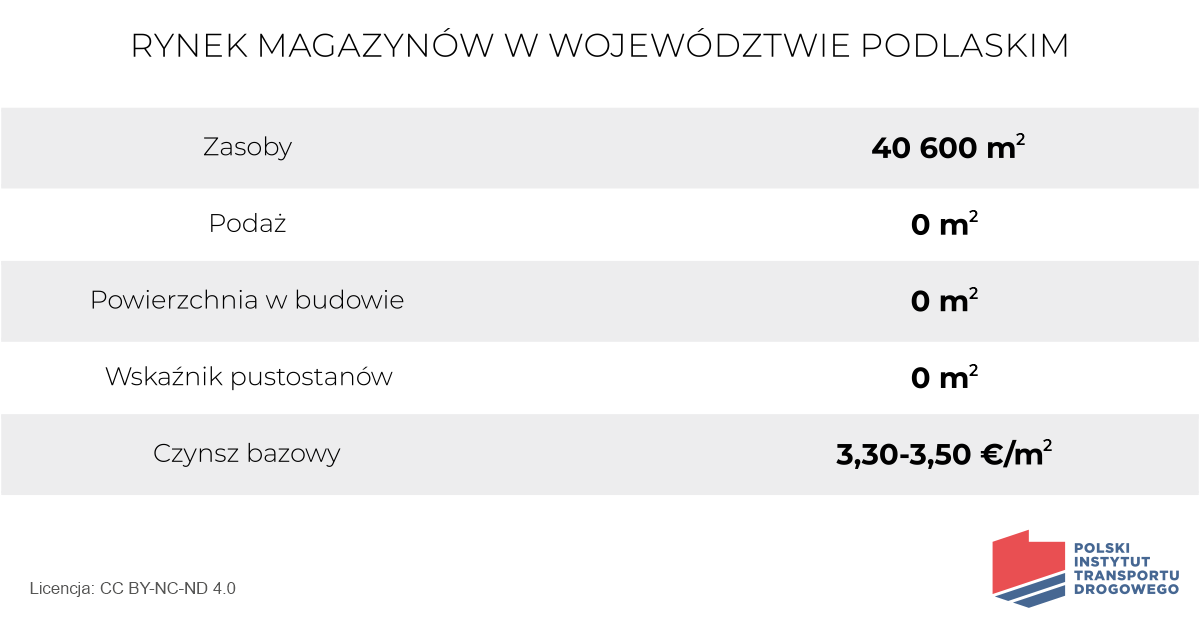 Aktualne zasoby magazynowe klasy A, województwa podlaskiego wynoszą 50,2 tys. m2\. Stanowią je dwa parki magazynowe. Jeden zlokalizowany w Białymstoku, oraz drugi w Łapach.