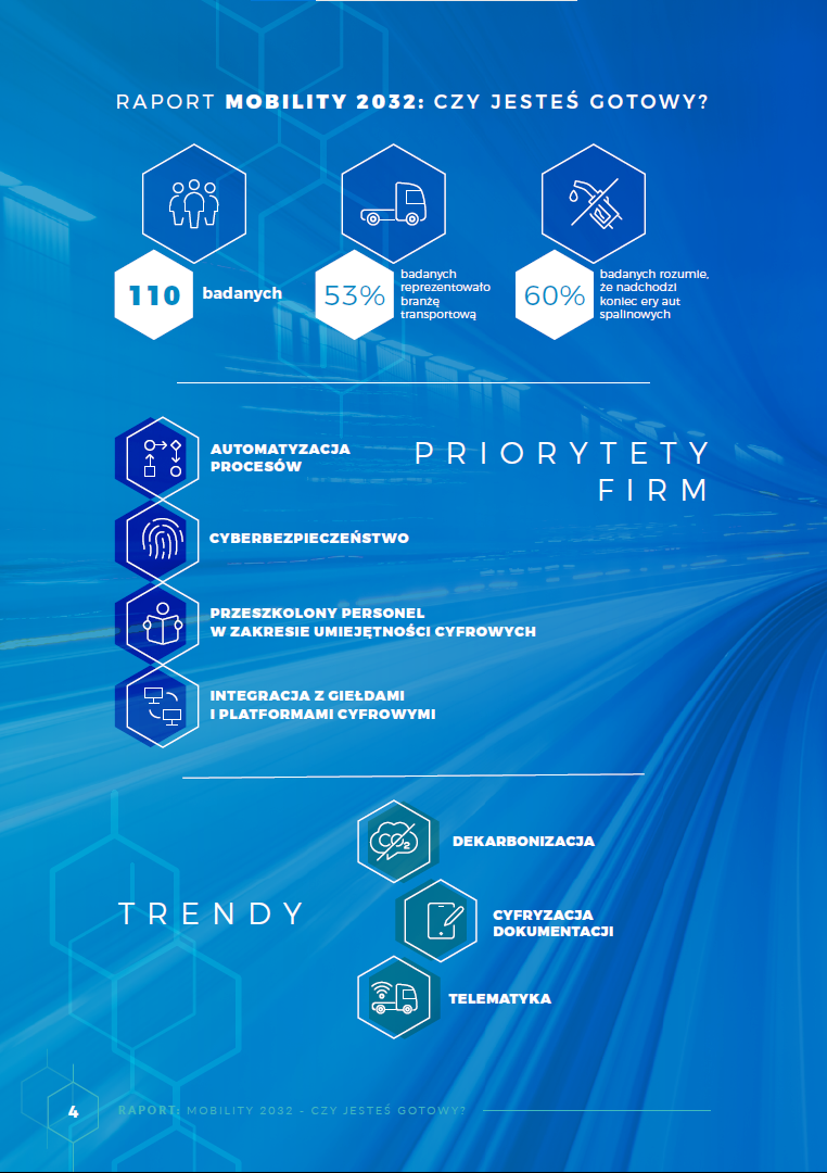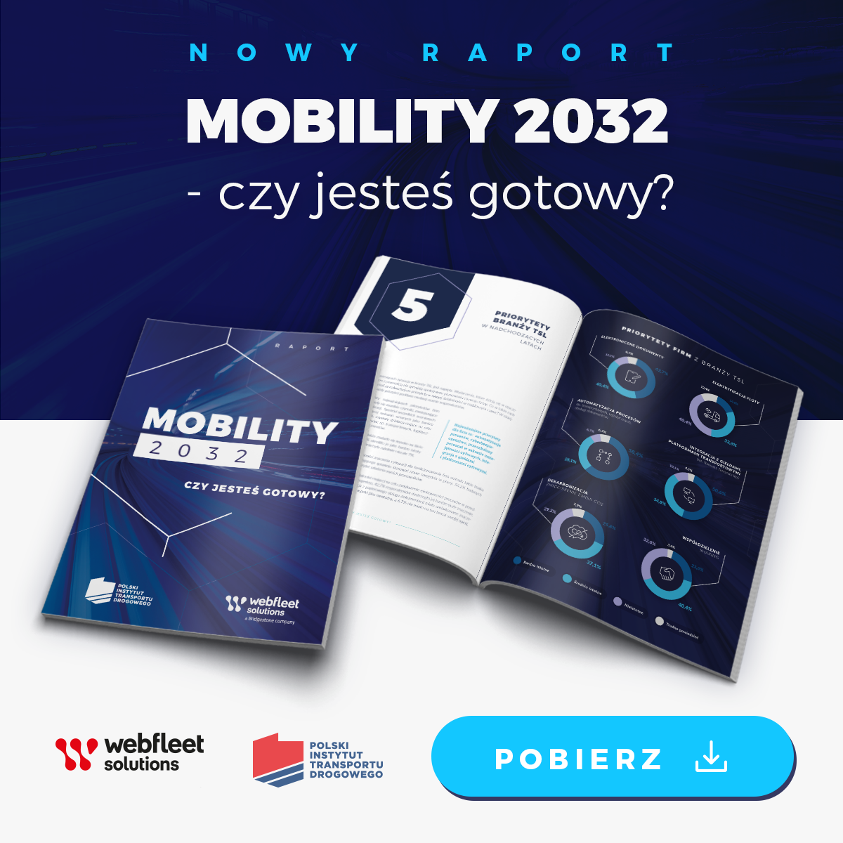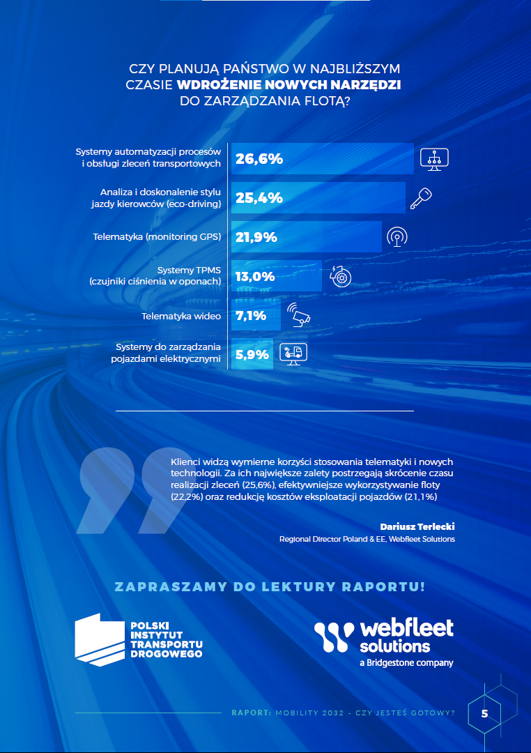 „Raport Mobility 2032 – czy jesteś gotowy?”, przygotowany przez Polski Instytut Transportu Drogowego wraz z Webfleet Solutions jest przeglądem kierunków, w które podążą przedsiębiorstwa z branży TSL w ciągu najbliższych 10 lat, do 2032 roku. Opracowanie odnosi się do wyzwań technologicznych, celów polityki klimatycznej względem transportu, a także tego, jak nowoczesna flota wpływa na walkę z emisją CO2\.