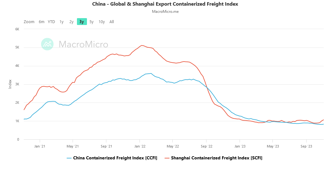 Wartość indeksu SCFI (Shanghai Containerized Freight Index) na trasie Chiny – Europa, 3 listopada wyniosła 1012,6 punktów i utrzymuje się na poziomie, około 1,1 tys. punktów, od początku 2023\. Oznacza to niskie ceny frachtu morskiego.