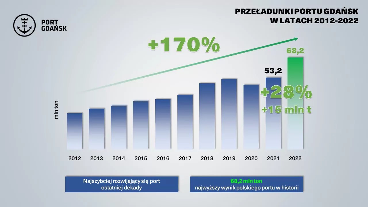 > Polskie porty morskie wygenerowały w 2018 roku 40,6 mld zł do budżetu państwa. Baltic Hub Gdańsk, charakteryzuje się potencjałem wzrostowym opiewającym nawet do 7 mln TEU. W roku 2022 przeładowano w Gdańsku 2072 tys. TEU. więcej o polskich portach w artykule: Polskie porty przebijają się do europejskiej czołówki