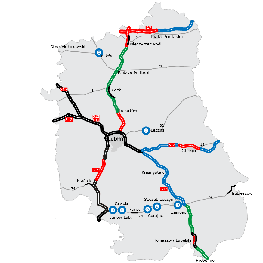 Stan inwestycji Via Carpatia w województwie lubelskim. W kolorze: czarnym – drogi w użytkowaniu; czerwonym – w realizacji; zielonym – w przetargu; niebieskim – w przygotowaniu. Źródło: Generalna Dyrekcja Dróg Krajowych i Autostrad