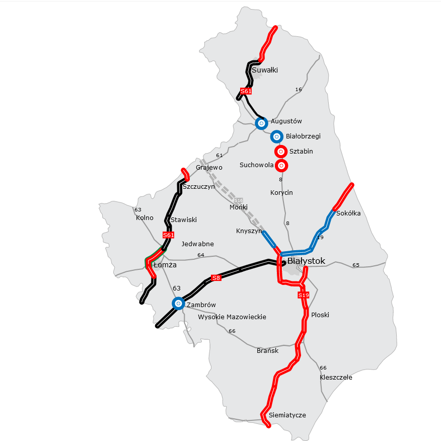 Stan inwestycji Via Carpatia w województwie podlaskim. W kolorze: czarnym – drogi w użytkowaniu; czerwonym – w realizacji; zielonym – w przetargu; niebieskim – w przygotowaniu. Źródło: Generalna Dyrekcja Dróg Krajowych i Autostrad