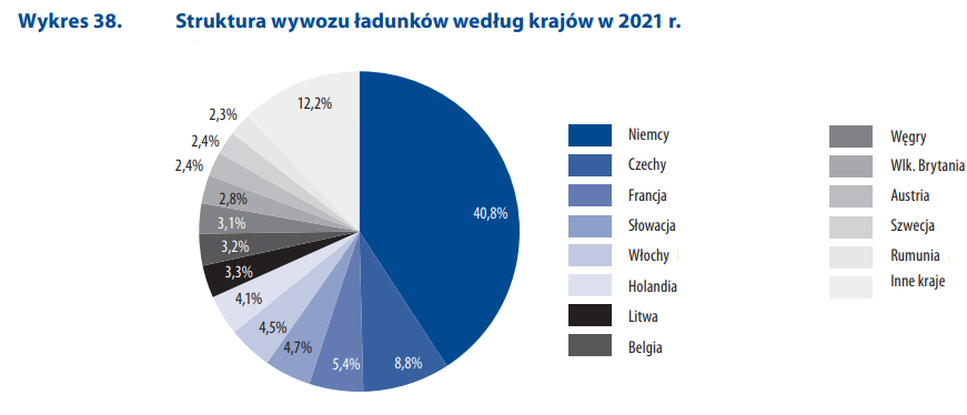 Z Polski za granice wywieziono 92,5 mln ton ładunków, to jest wzrost o 5,5% niż przed rokiem. Zarówno eksport i import do Polski przewozem drogowym notował wzrosty. Najczęściej polskie ciężarówki jeździły do krajów Unii Europejskiej. Najwięcej ładunków wywieziono do naszego zachodniego sąsiada, ale i przewozy do Czech miały stosunkowo wysoki udział. W 2021 roku import do Polski osiągnął poziom 77,4 mln ton, ze wzrostem 4,2% do roku poprzedniego. Podobnie w imporcie dominowały relacje z Niemcami i Czechami.