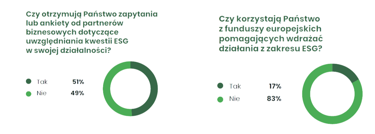 Bariery wdrażania ESG: Największym wyzwaniem dla firm jest brak wsparcia edukacyjnego (44%) oraz kadrowego (24%). Tylko 8% firm korzysta z funduszy europejskich wspierających wdrażanie działań ESG.