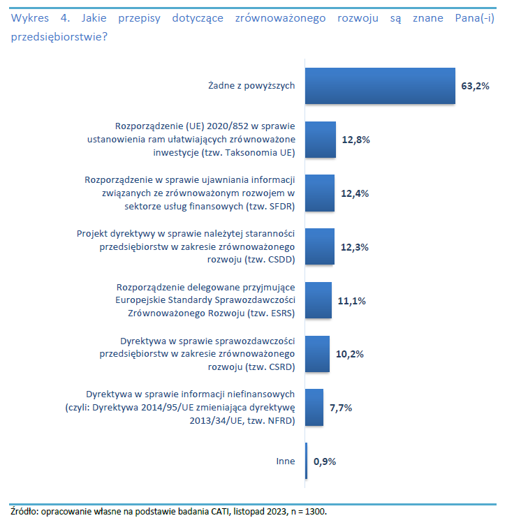 Jednym z największych wyzwań, przed jakimi stoją polskie MŚP, jest brak znajomości przepisów prawnych dotyczących zrównoważonego rozwoju. Aż 63% badanych nie zna żadnego z wymienionych w ankiecie przepisów, a tylko co dziesiąty potrafił je zidentyfikować. Warto podkreślić, że znajomość tych regulacji jest kluczowa dla płynnego wprowadzenia nowych standardów w działalność firm.